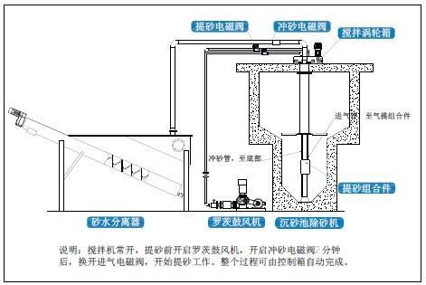 由於葉輪葉漿向上傾斜,旋轉時將使池中的汙水呈螺旋狀加速,形成渦流態,產生留心力。同時池內汙水流在葉輪葉片攪拌剪切力的作用下,互相剝離,依靠砂的自身重力和旋流的離心力,使砂粒沿池壁呈螺旋線加速沉降,向中心砂鬥積聚,經氣提或泵提升後排出池外作進一步的處理。在此過程中,適當的槳葉角度和線速度條件,使汙水中的砂粒受到衝刷,並保持好的沉降效果,而原來粘附在砂粒上的有機物,以及重量小的物質,隨汙水一同流出旋流沉砂池,進入後續工序繼續處理,砂與少量汙水進入池外砂水分離器內,砂經分離後外排,汙水回流至格柵井。