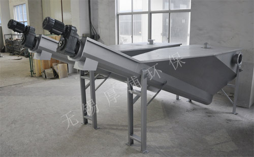 砂水分離器設備一般螺旋傾角為25~30°之間,砂水混合液從進水管進入本設備,混合液通過分離機上部的聚集箱,在水流的作用下,使混合液的砂粒與有機物進行分離,砂水進入集砂槽中,比重較大的顆粒(如砂粒)由於自重而下降,沉積於螺旋槽底部,在螺旋葉片的推動下,物料沿斜置的U型槽底部提升,離開液麵後,繼續上移一段距離,砂粒中的水分逐漸在螺旋槽葉片的空隙中流回水箱,砂粒液逐漸幹化到出料口處,依靠自重落入其他輸送裝置中,上清液則不斷從排水堰溢流出去,有機物在水流漩渦的作用下,也跟著上清液從溢流槽流出,回流至汙水井中,從而達到砂水分離的作用。