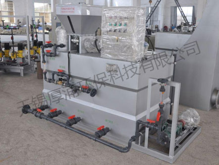 幹粉絮凝劑從螺旋推進器內進入速溶器內與清水進行預混,被濕潤的物料進入配製槽進行攪拌稀釋,按要求濃度進行配製;配製過程中,進水量在流量計觀測下必須相對穩定,從而保證在整個工作工程中,配製溶液濃度不變。