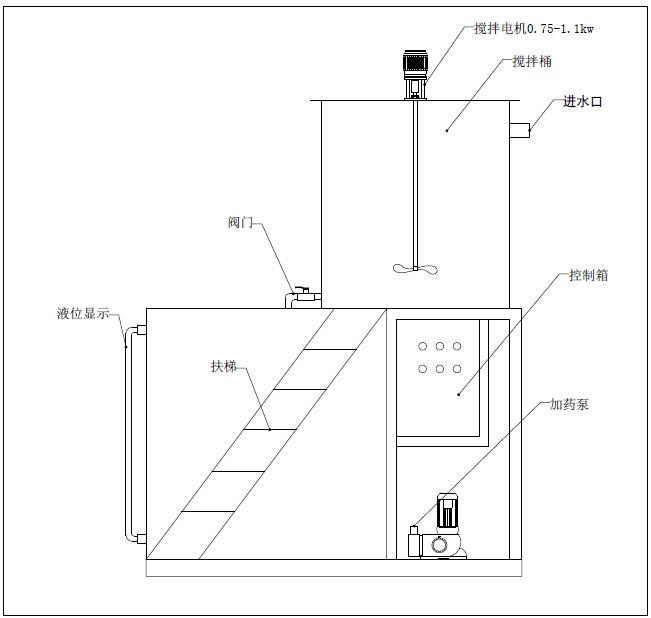 2、存藥箱:用於存放已經攪拌好的溶液,供投加設備用。